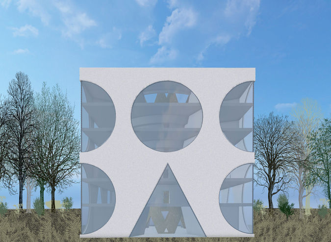 Dieses Schulhaus besteht aus einem Kubus, zwei auf einander stehenden Kegeln, Kreisen und Dreiecken, einer klaren geometrischen Formensprache. Von Aussen gesehen ist es ein Kubus mit den dreieckigen Eingängen und den runden Fenstern. Im Schnitt gibt es eine Verbindung mit dem Aussenraum über die grossen Oberlichter. Durch die unterschiedlichen Räume und Situationen sollen die Besucher zum Entdecken einladen werden.