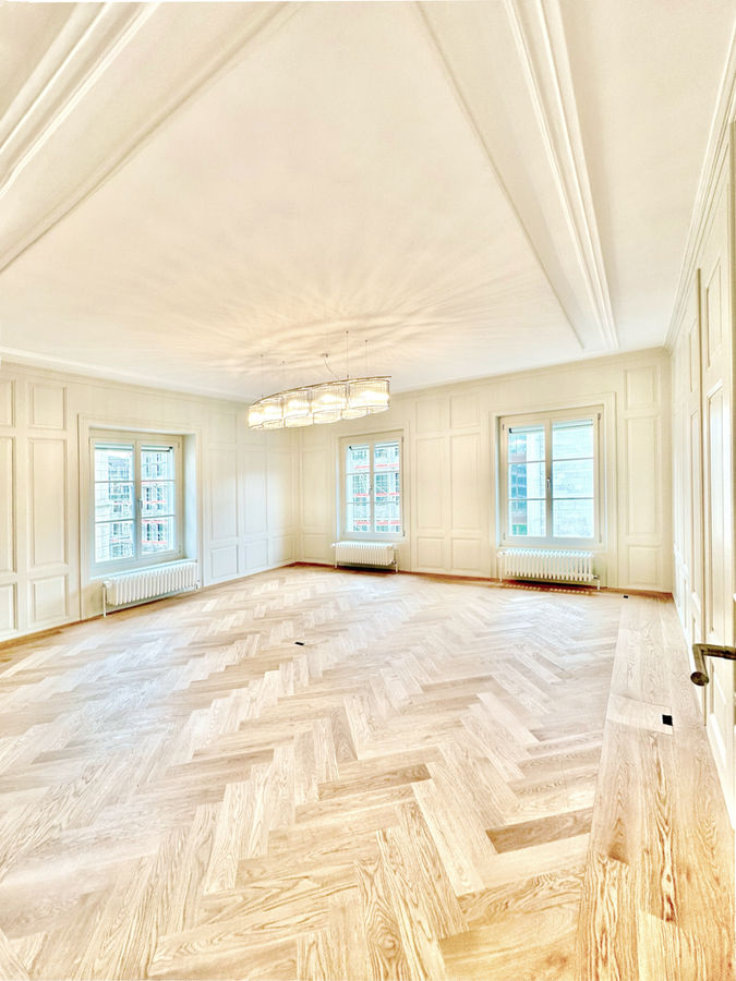 Das neue Konzept soll die architektonischen Elemente hervorheben. Mit Deckenabsätzen, Stützen- und Wandpfeilern, Materialien und Farbgestaltung werden die neuen, im Grundausbau offenen Räume fein gegliedert. Dazu gehört zum Beispiel auch ein Erschliessungskorridor zur Bürofläche. Die Obergeschosse 1 bis 4 im Grundausbau sind in Layout und Raumstruktur identisch – mit dem bestehendem Treppenhaus, den zwei geschützten Räumen auf der Seite Paradeplatz, zwei Liftanlagen und zwei WC-Anlagen. Die bestehende Raumeinteilung soll mittels kassettierter Decke und aufgelöster Enfilade mit Jochen erkennbar bleiben und den Mietern von Einzelbüros oder Grossbüroflächen die Nutzungsflexibilität ermöglichen.
